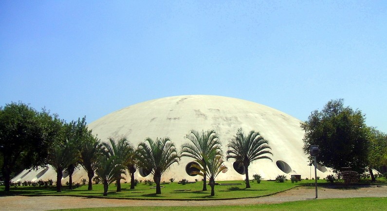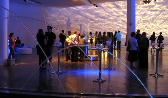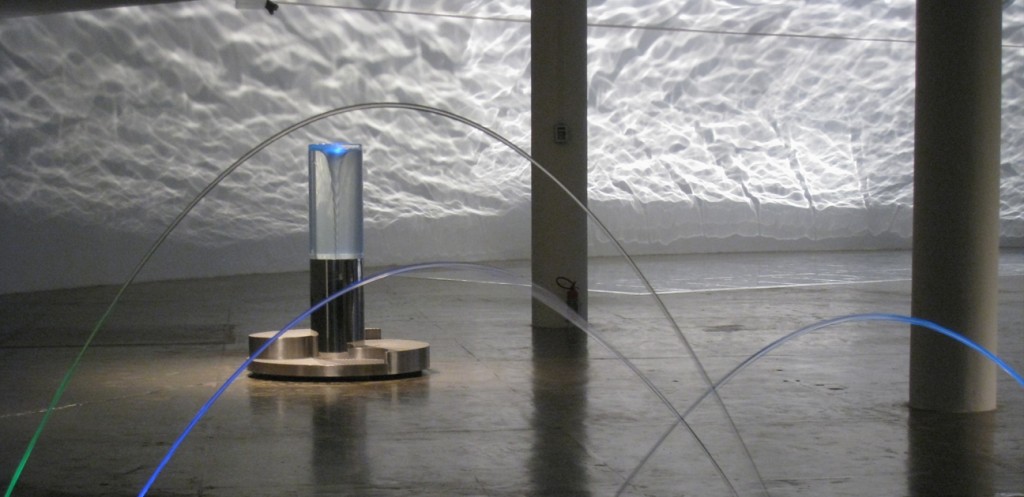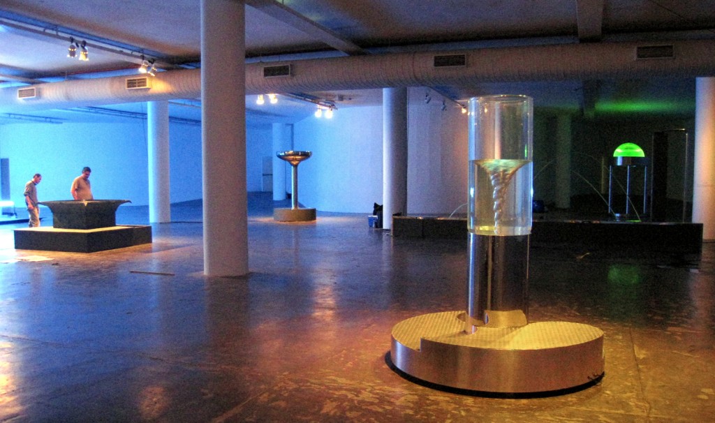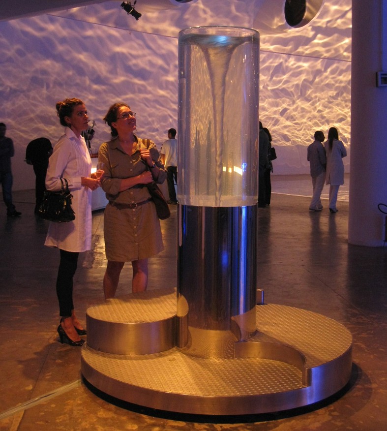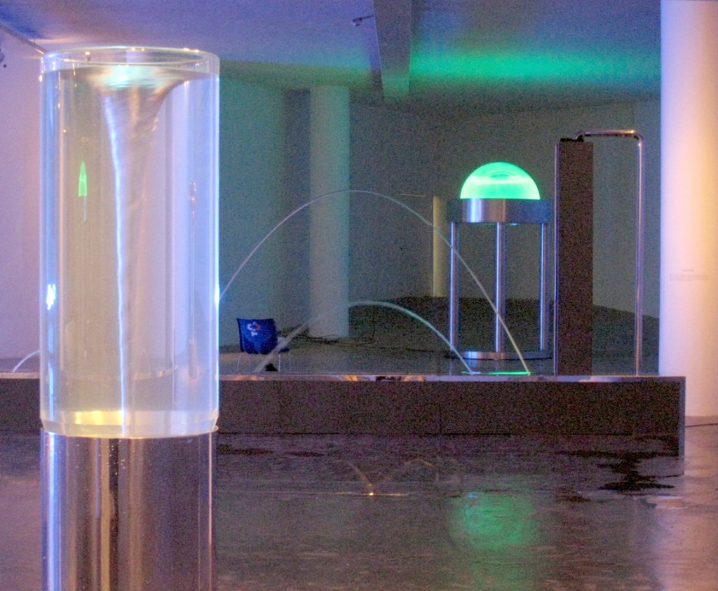 In November 2010 five water sculptures were shipped to Sao Paulo for a major exhibition on the theme of water. The exhibition was held in the Oca building designed by Oscar Niemeyer in the 1950s. Natural light floods into this vast shallow dome through portholes punched around the perimeter. William Pye was the only British artist exhibiting there and the only one to incorporate water – all other exhibits simulate or represent water by various means. Each of the five water sculptures says something about the way water behaves: Scylla shows a vortex, Tavola exploits reflection, Delos features laminar flow jets, Coanda shows how water clings to surfaces, and Aureola features water activity in a double skinned transparent dome that can be viewed from inside and out.