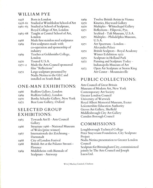 As part of the Brighton Festival in May and June 2019, a collection of fourteen of Pye’s water sculptures between 1994 and 2010 and Charioteer, a bronze sculpture from 1964, were shown in the Secret Garden in Kemptown, Brighton.