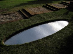 This forms an anamorphic projection where, from the upper and lower ends of the site, it appears to the eye as a circular disc of shimmering water.