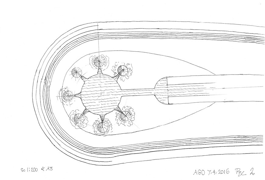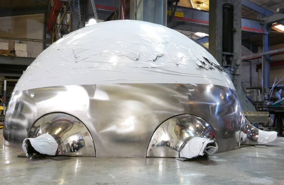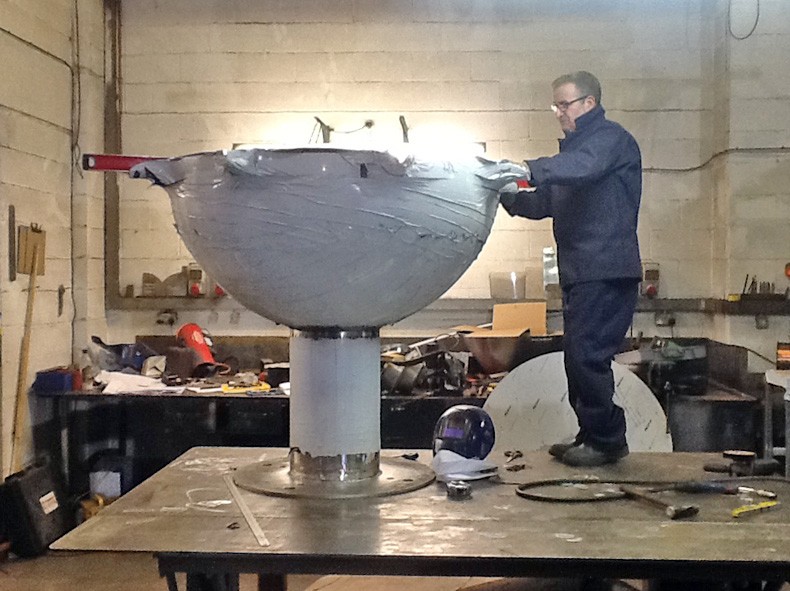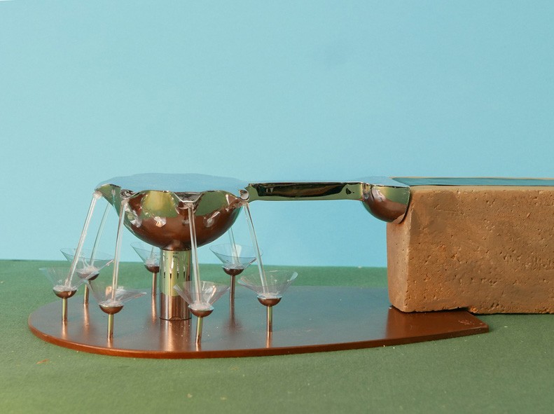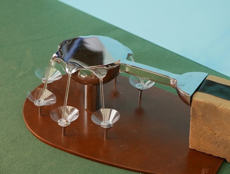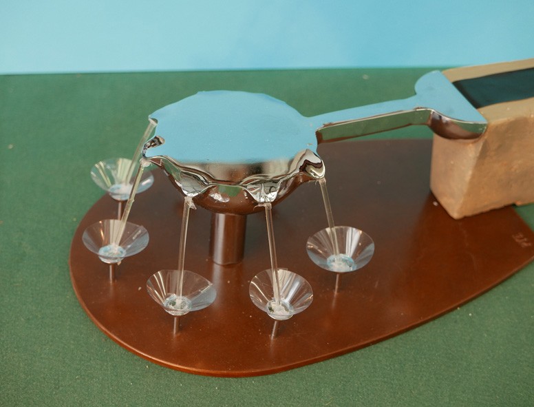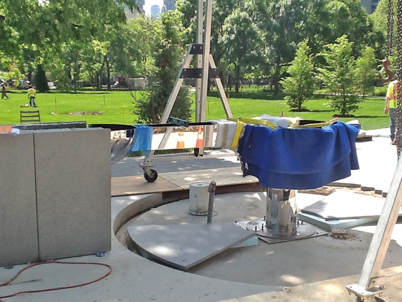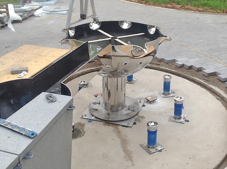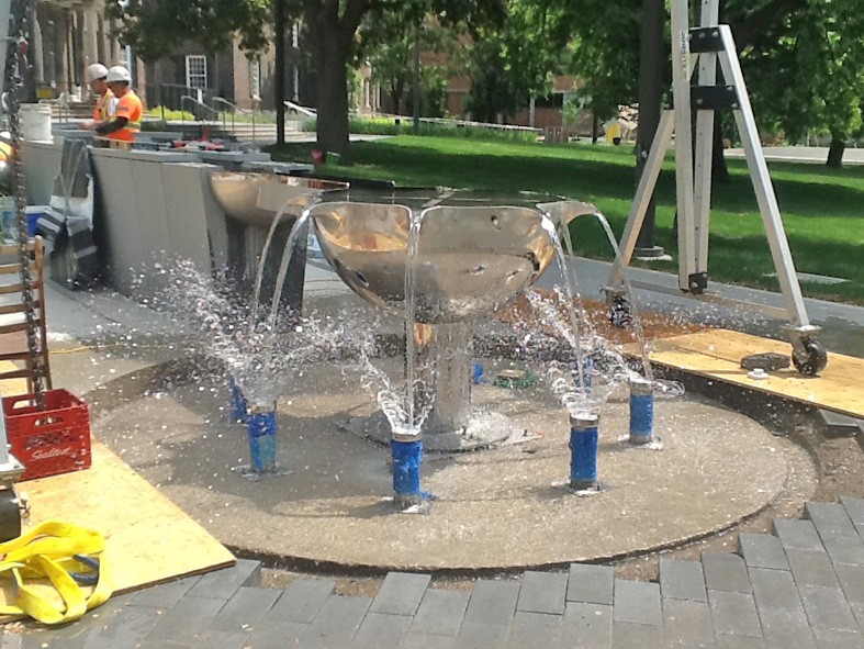 This water sculpture resulted from a limited competition to design an artwork for the circular area at the end of a curved wall carrying a rill of water across the park. The design is a mirror polished stainless steel bowl which receives the water from the rill, with seven spouts delivering laminar flowing water into cups. The cups break the flow and create animation of the water that can be seen from a distance.