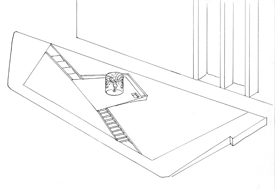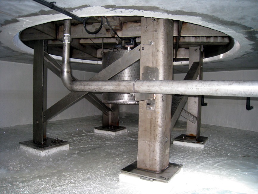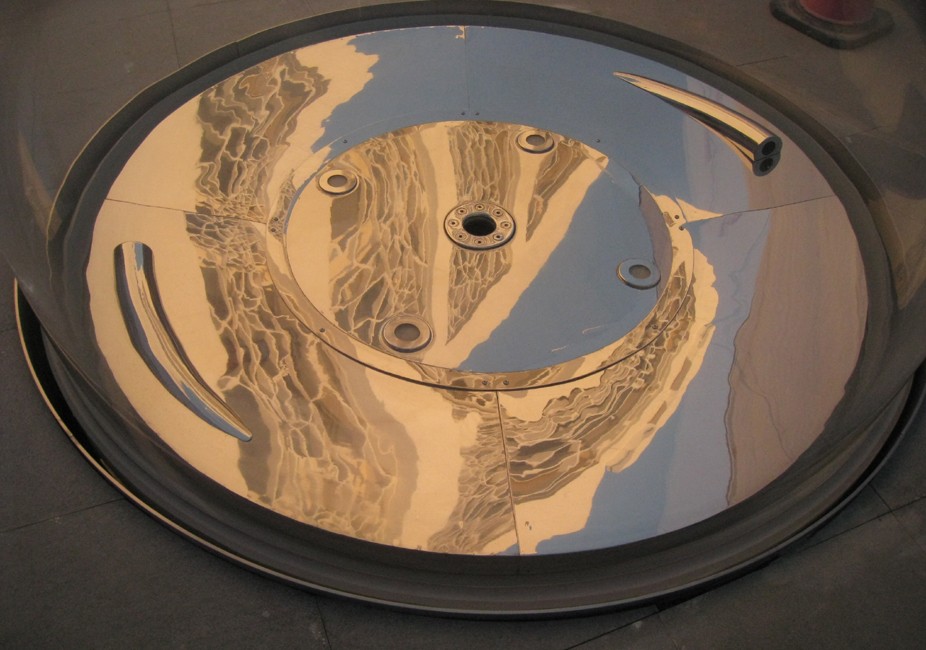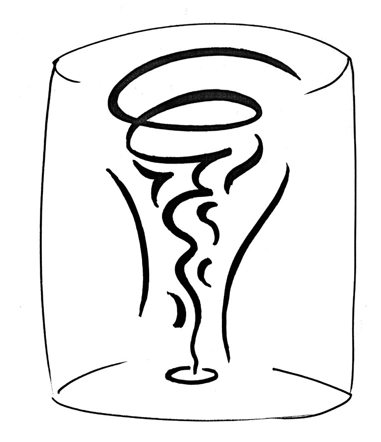 The vortex operates to a preset programme of about fifteen minutes where the vortex rises turbulently in the cylinder, until the water flows over the top edge and down the outer surface. After a while the pump switches off and the vortex becomes calm and stable while the level drops.