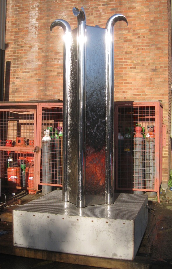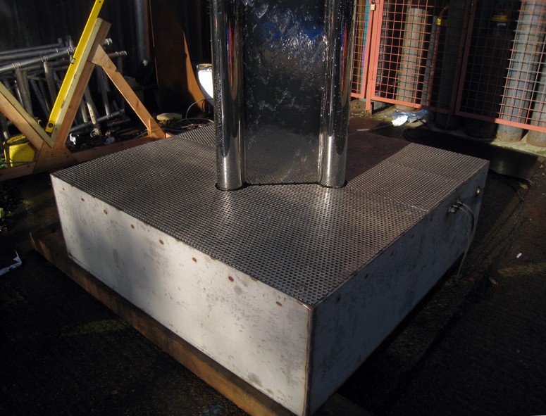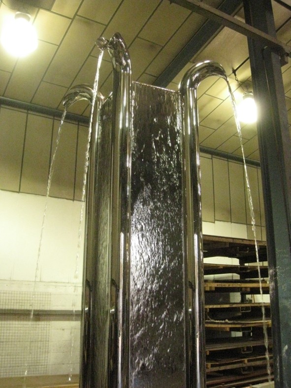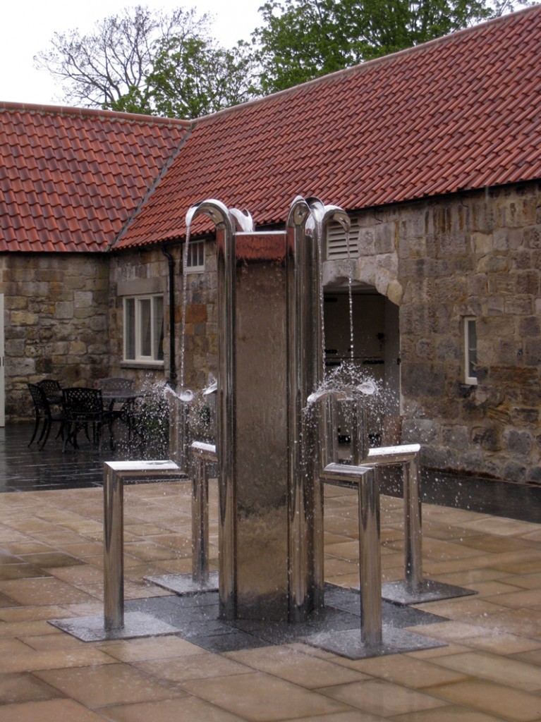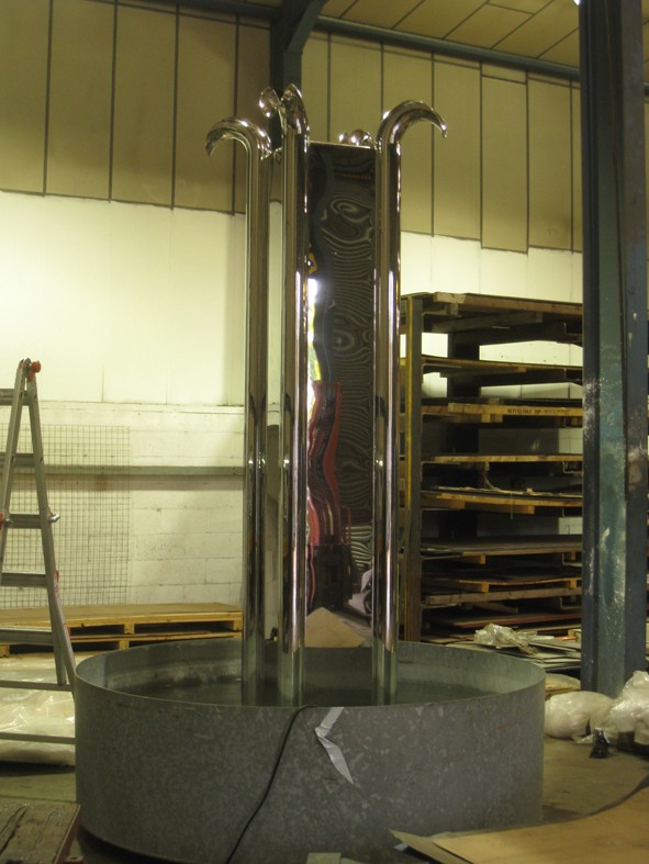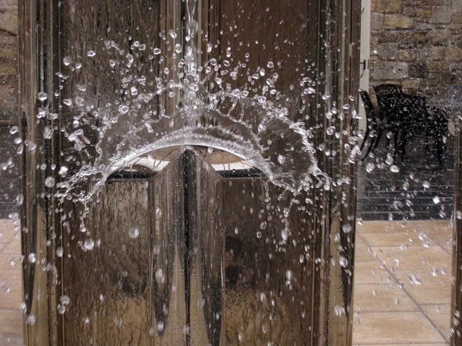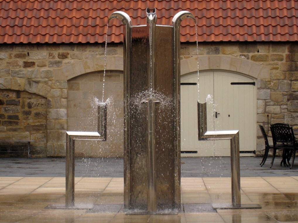 The chosen material was mirror-polished stainless steel in order to catch the light, reflections and moving water animating the whole. At 2.5 metres high, it provides a clearly visible feature when seen from various positions within the house. A spout on each of the four corners delivers a smooth rope of water, and deflectors below each spout transform the smooth flow into a dancing spray.