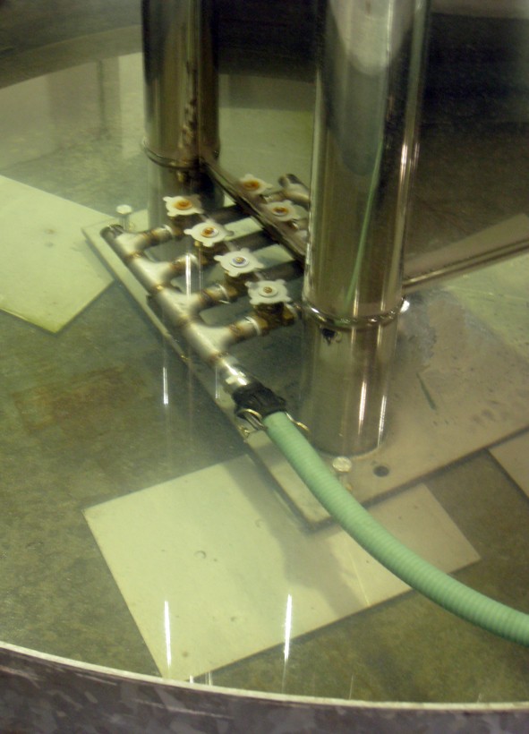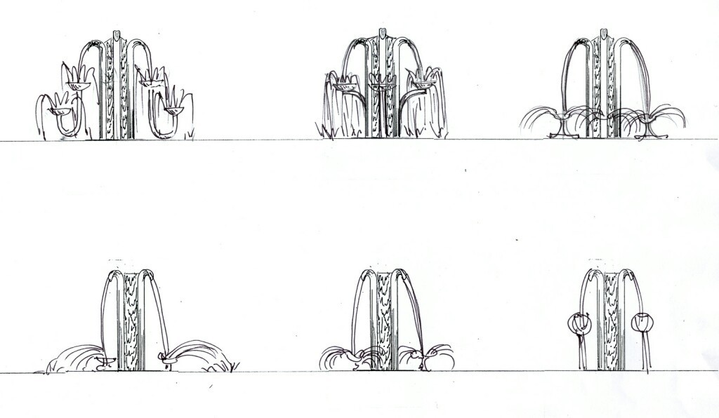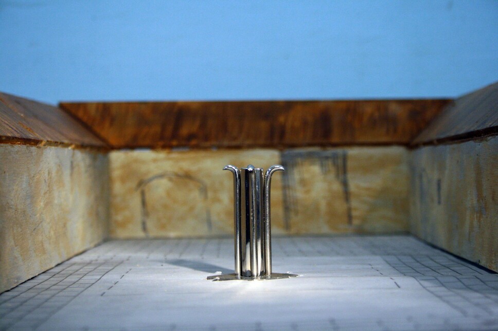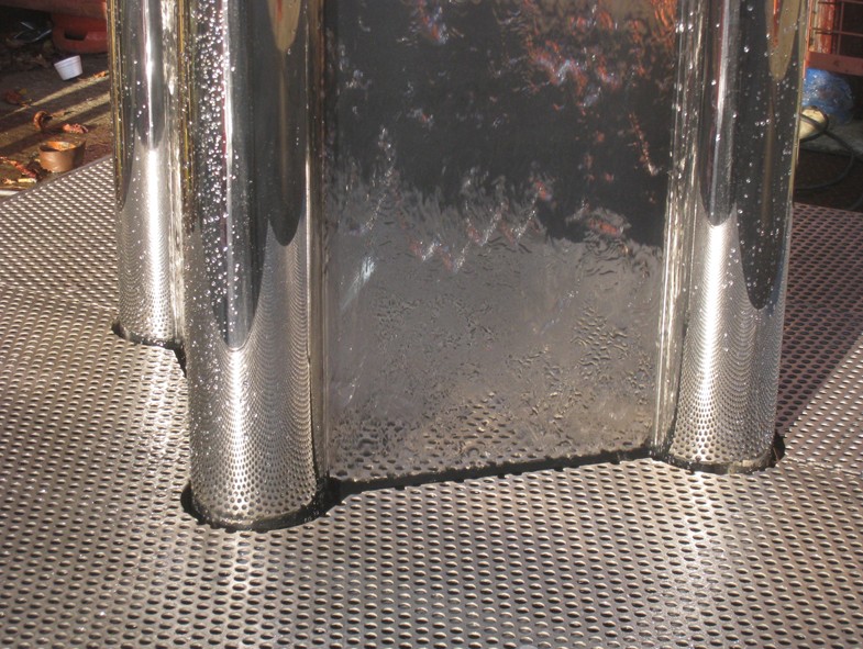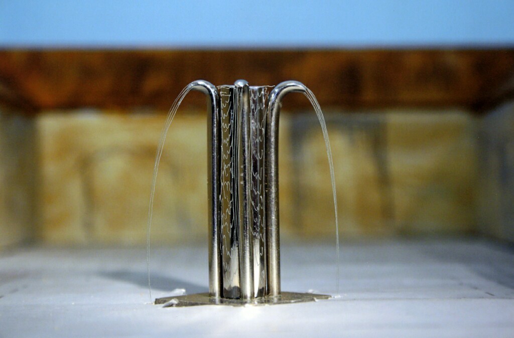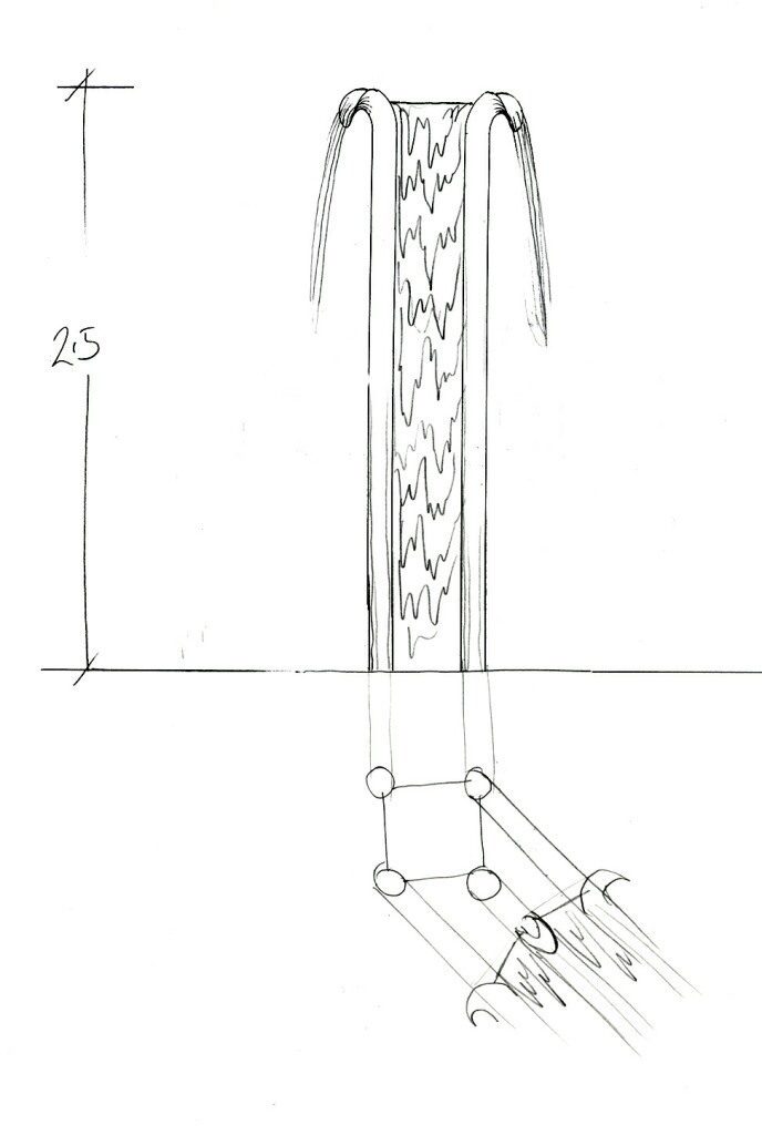 The chosen material was mirror-polished stainless steel in order to catch the light, reflections and moving water animating the whole. At 2.5 metres high, it provides a clearly visible feature when seen from various positions within the house. A spout on each of the four corners delivers a smooth rope of water, and deflectors below each spout transform the smooth flow into a dancing spray.