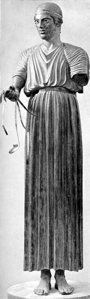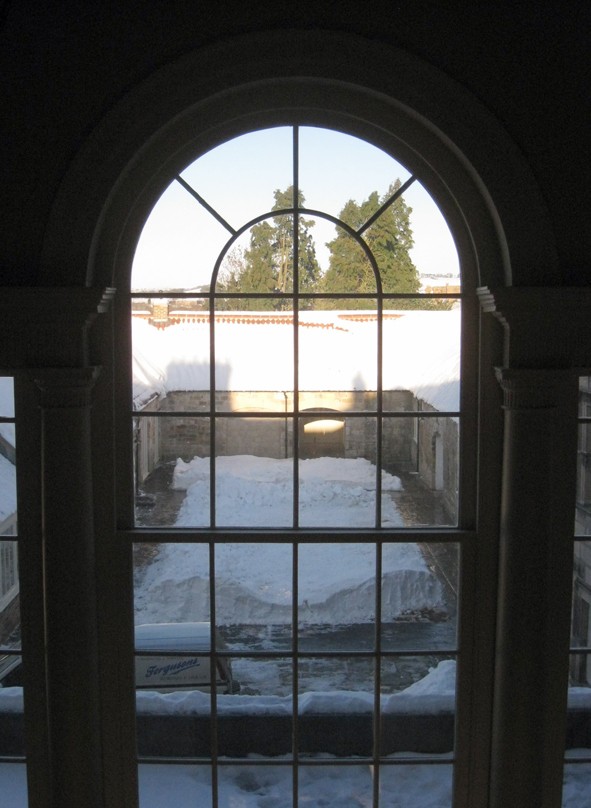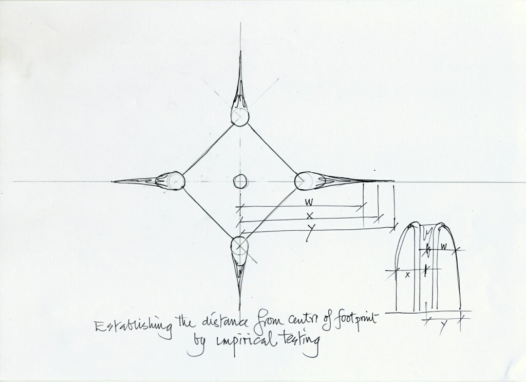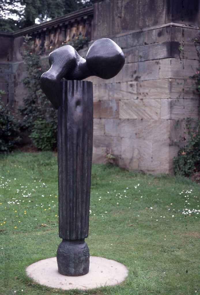 The distance from the main house and views from the upper level suggested to me a vertical sculpture for this courtyard. My proposed solution was a descendant of my 1964 sculpture ‘Charioteer’ inspired by my first visit to Greece, when I saw the Charioteer at Delphi, the vertical folds of the chiton that hangs around the body suggesting a fluted column, in contrast to the more dynamic form expressed in the upper body.