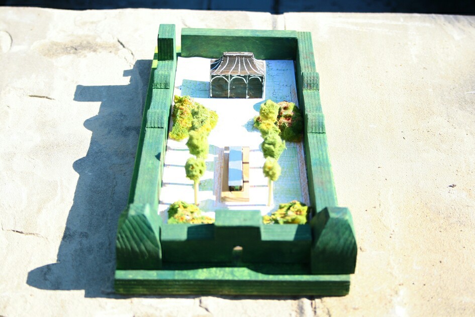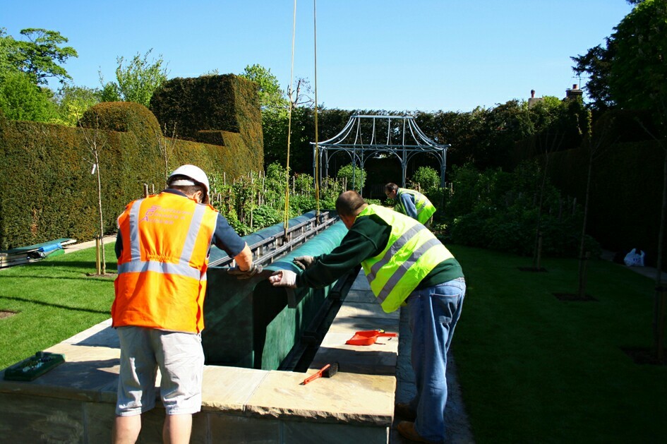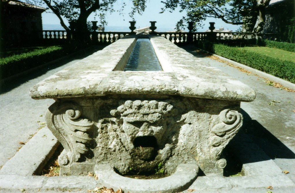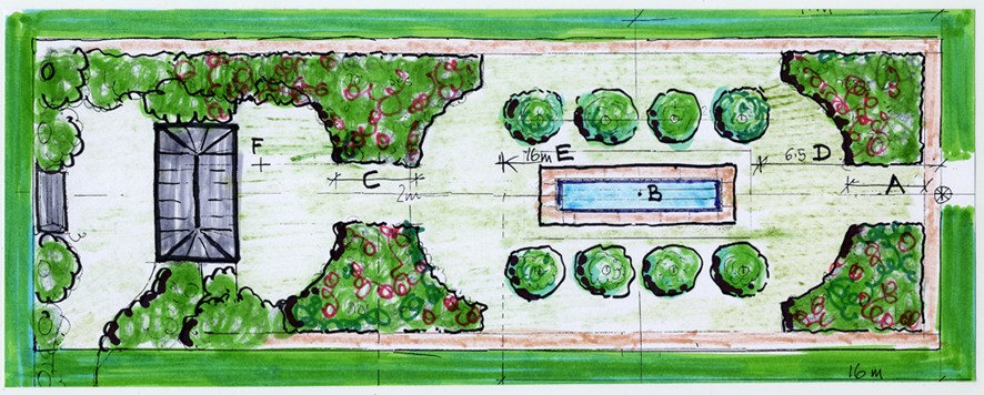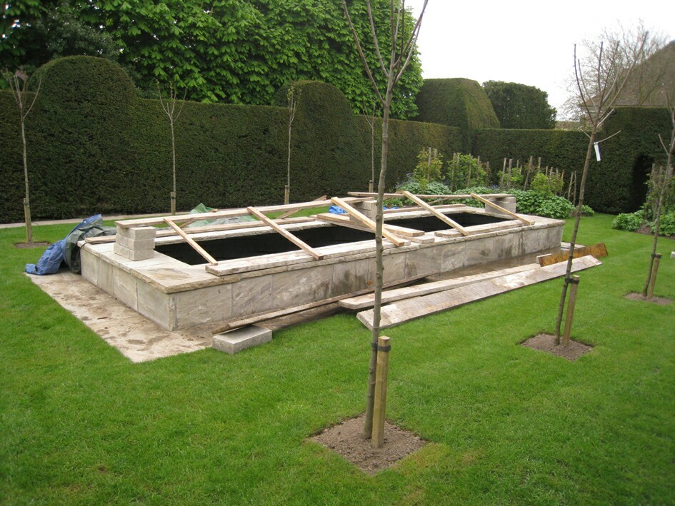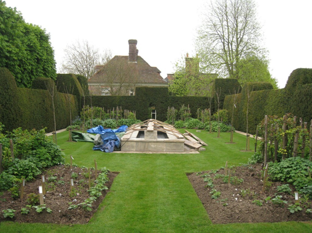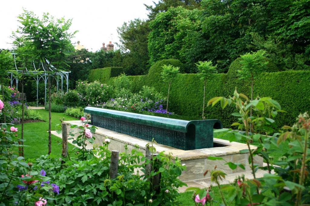 The proportions of the rose garden at Clinton Lodge suggested to me a linear piece and I was immediately put in mind of that amazing feature at Villa Lante in Italy known as ‘The Cardinals Table’. As soon as I saw the site enclosed by the high yew hedges, I realised that the position of the flower beds was such that one would get no distant views of the feature, which would have to be approached around the side and seen laterally from one side to the other at close quarters. When I explained this to the client she very generously invited me to redesign the layout of the whole garden.