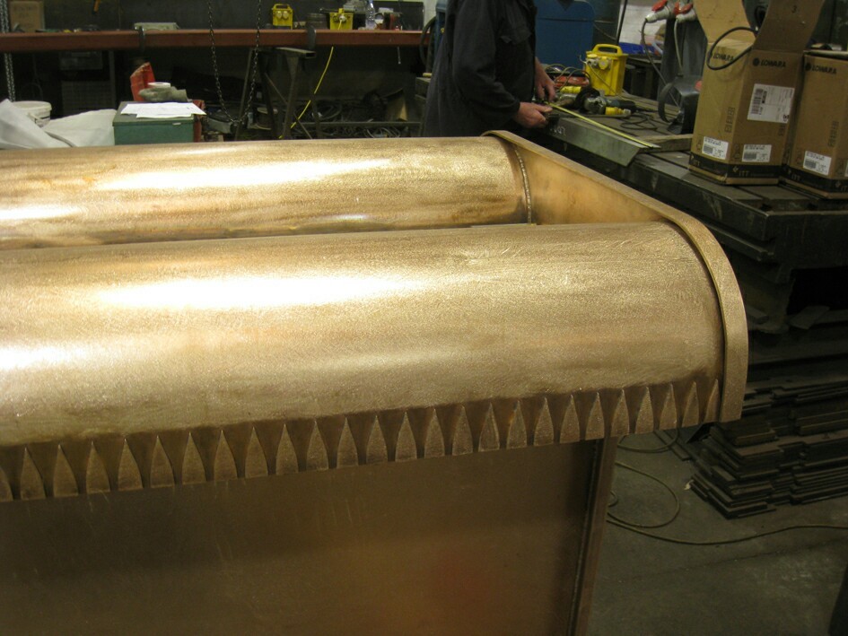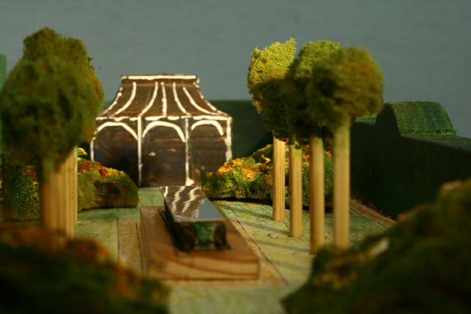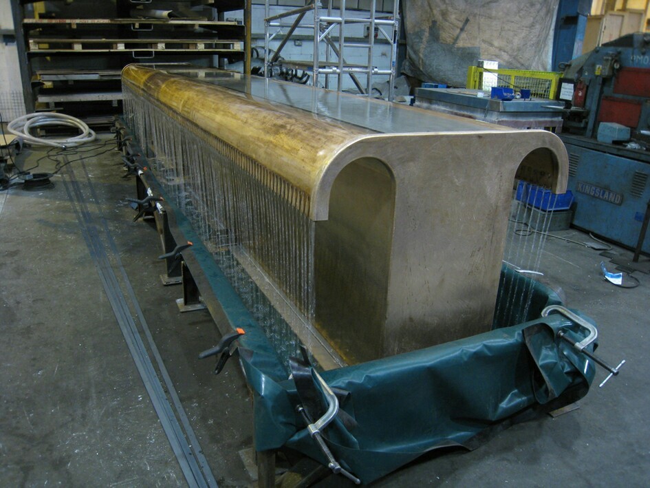 The piece is in patinated bronze and is 6 metres long. I used the device I have developed for dividing a film of water into a curtain of falling threads. Tavoleau exploits reflection of the the surrounding trees and flowers with both distant and close up views. See the video here.