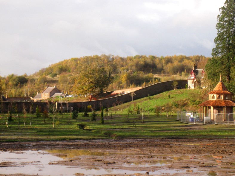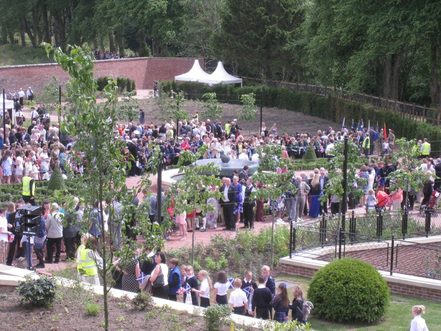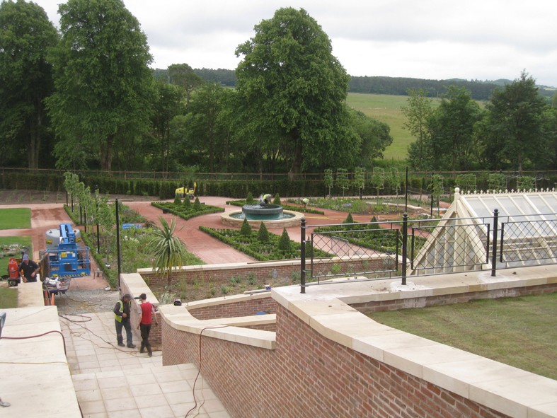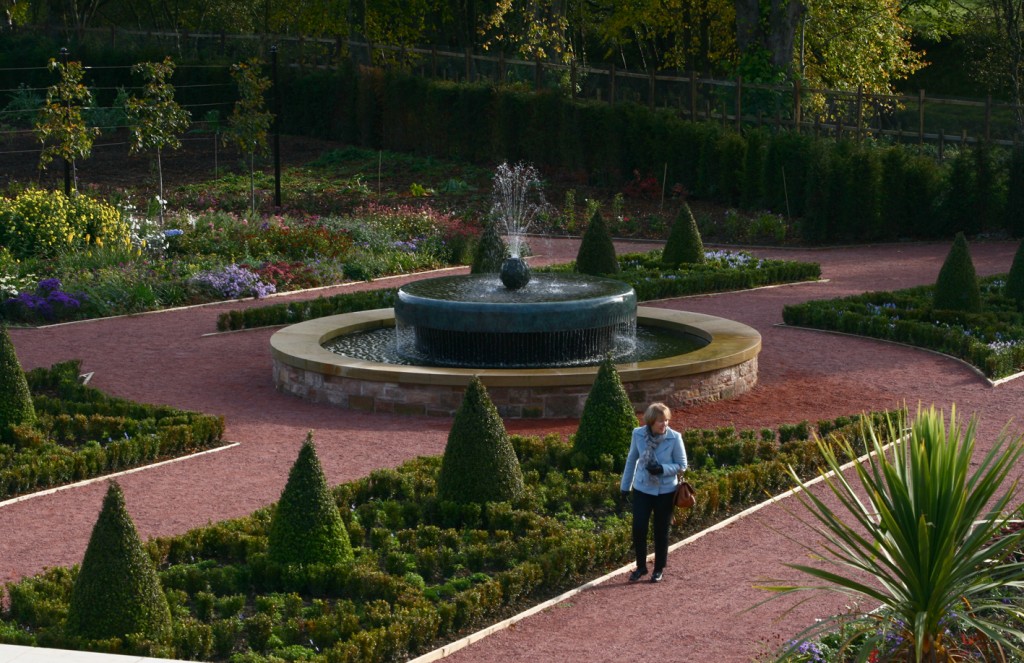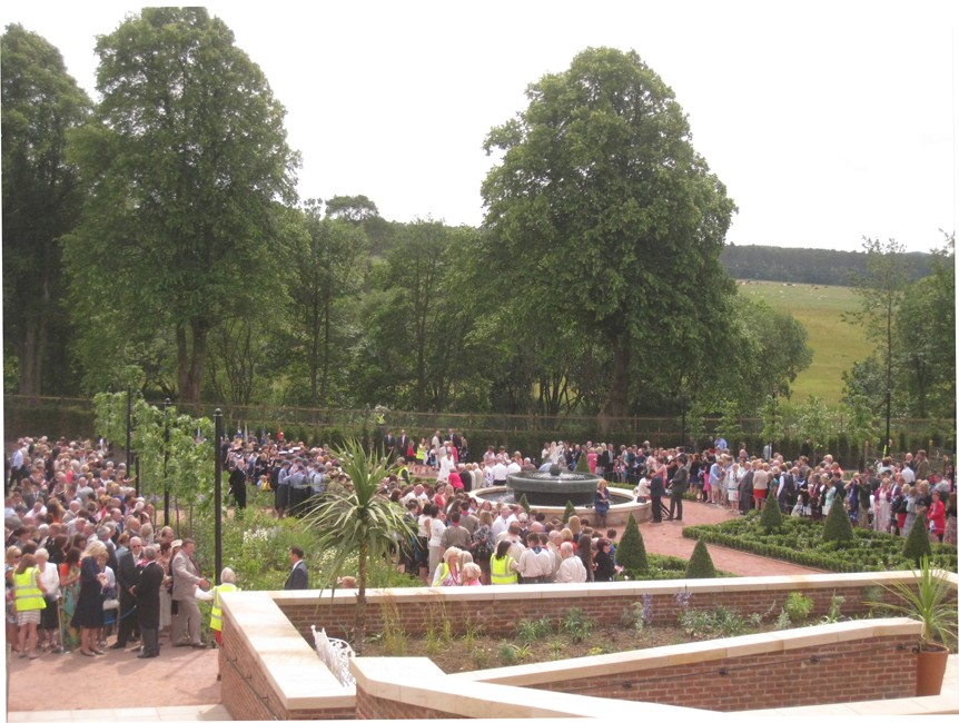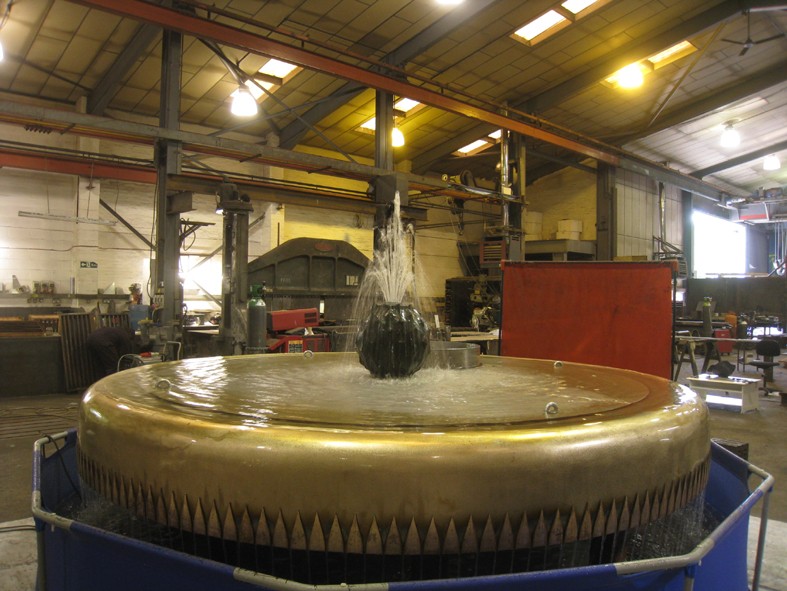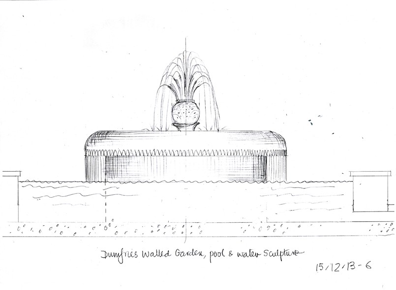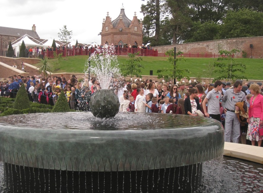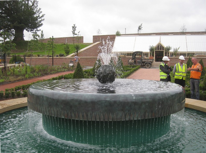 The restored Walled Garden at Dumfries House in Scotland was officially opened in July 2014 (now called the Queen Elizabeth Garden). The fountain is on two levels. For the centrepiece I modelled a thistle flower – Scotlland’s symbol – cast in bronze with jets of water. The water flows over a circular bronze weir to the lower level, divided into a curtain of threads or rods.