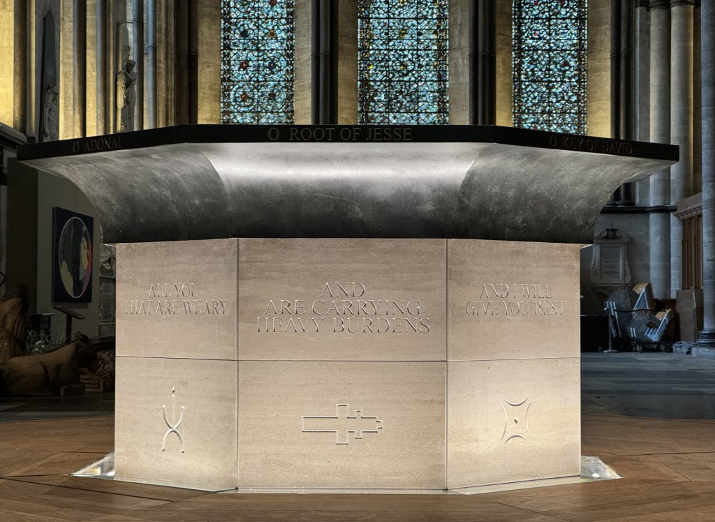 The Spire Crossing altar is octagonal with carved texts on each of the facets, taken from the Gospel according to St Matthew. Eight antiphons are engraved around the top edge of the bronze. Also on the facets are icons that make reference to details observable inside and outside the Cathedral.