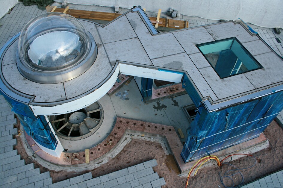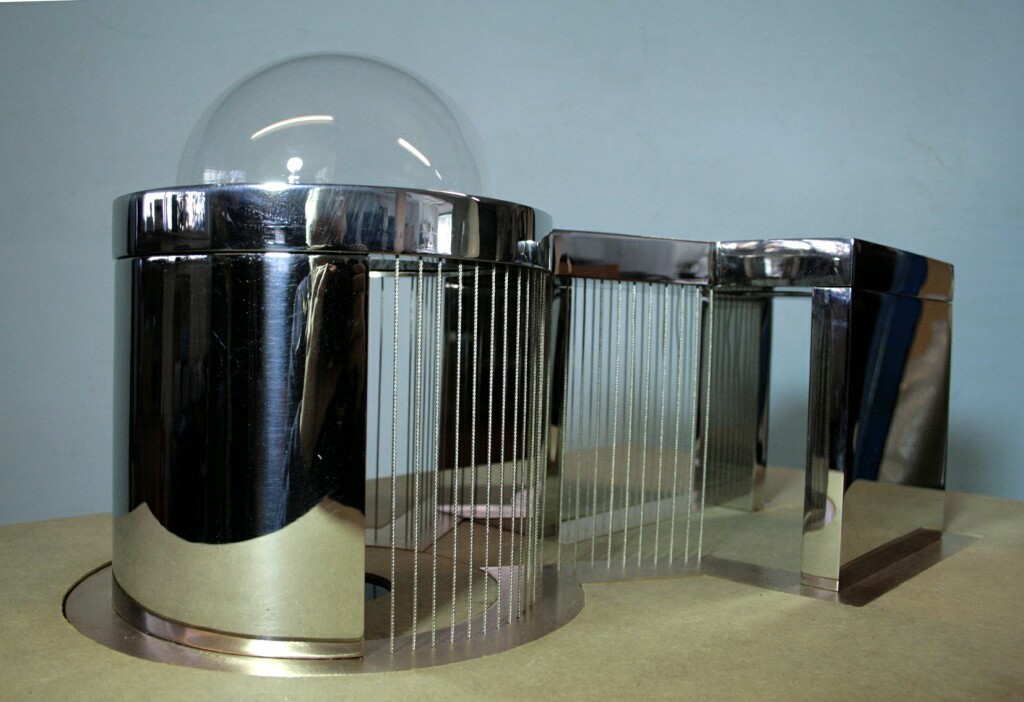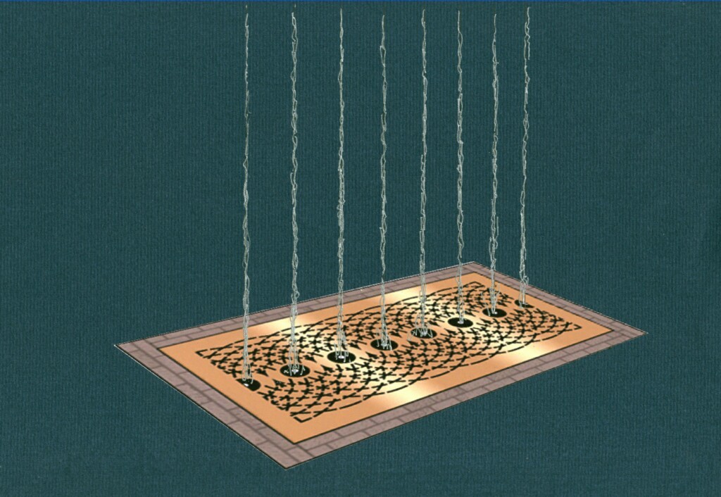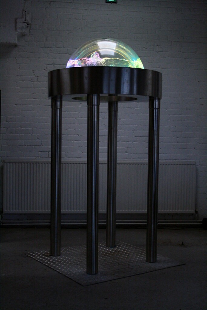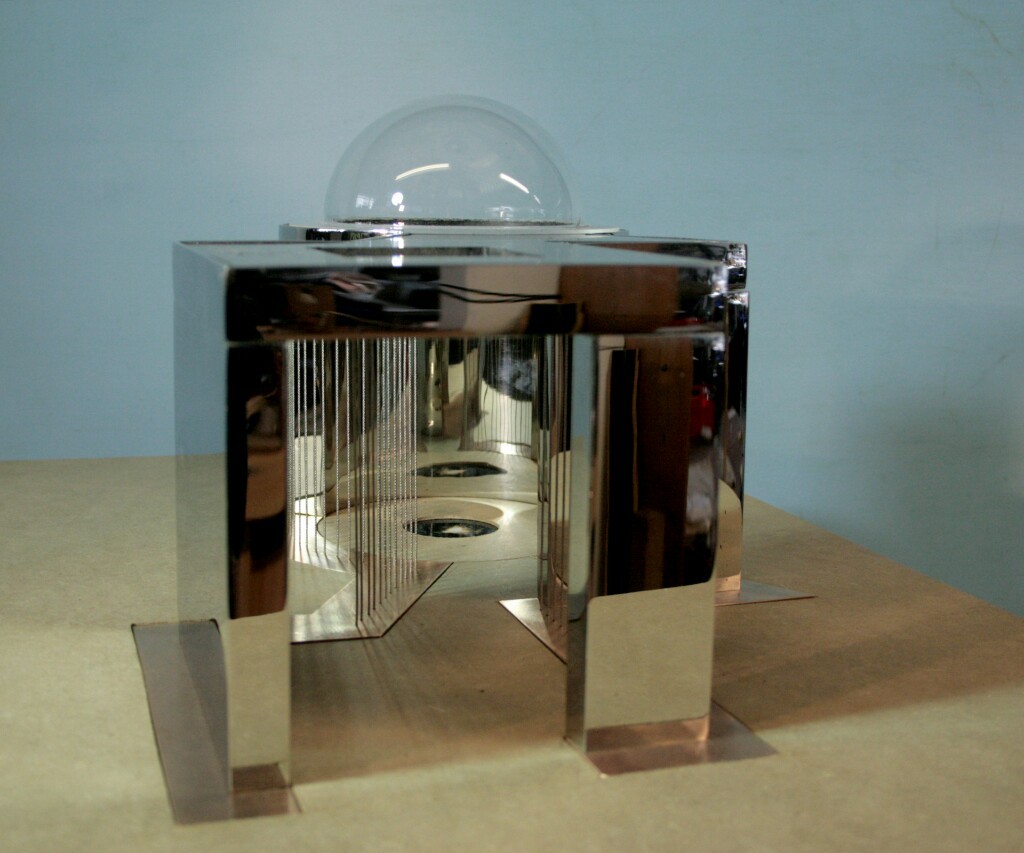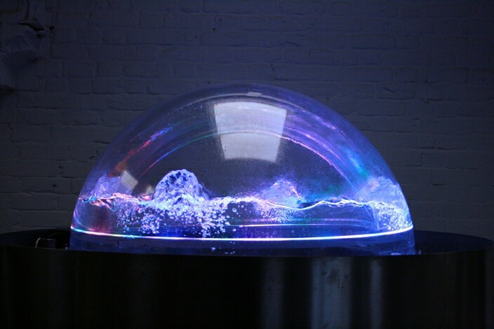 There is rollwaving water on the outside of the mirror-polished stainless steel walls, and curtains of jetted water. On the top a double skinned transparent dome contains lively water activity with programmed LED lighting.